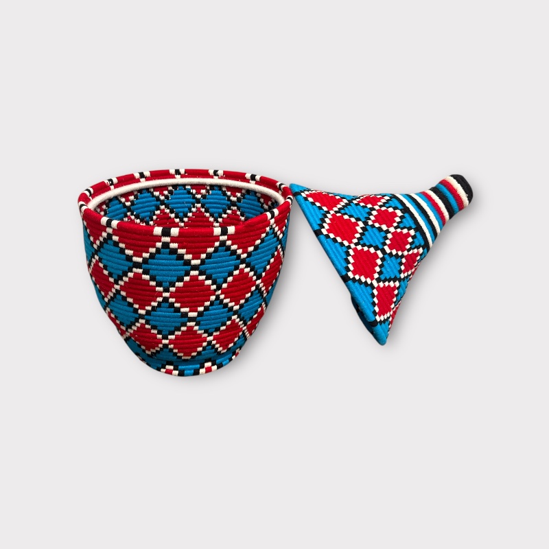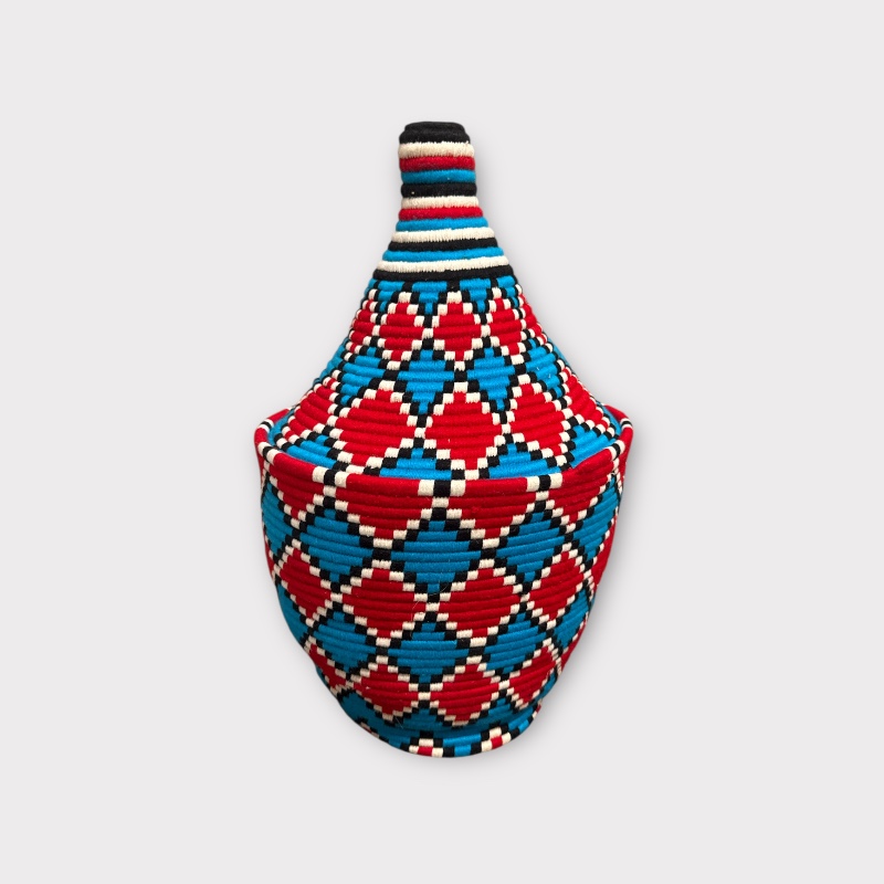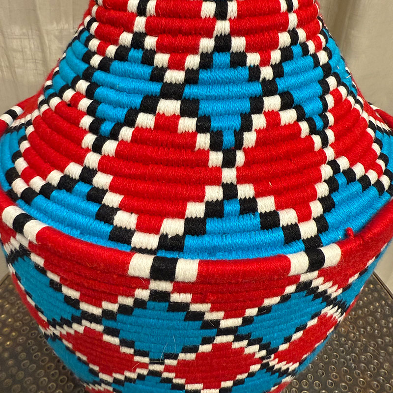 Woven by women artisans in Morocco’s Atlas Mountains, each basket is the result of generations of skill, patience, and creativity. Using natural grass wrapped in wool threads, artisans bring the vibrant colors of red, turquoise, black, and ivory together in a pattern that symbolizes balance, strength, and harmony.