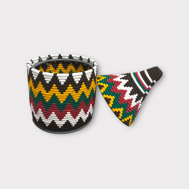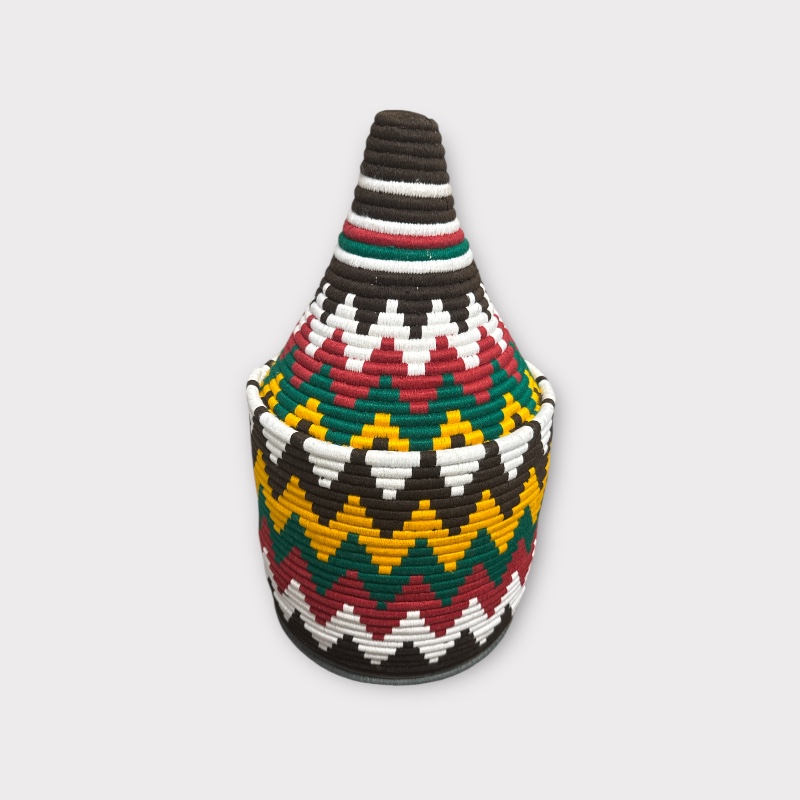 Handwoven by women artisans in the mountains of Morocco, each basket is created using traditional techniques passed down through generations. Crafted from natural grass and wrapped with soft wool threads, the warm tones of yellow, green, red, brown, and white evoke the sun, earth, and vibrant landscapes of Morocco.