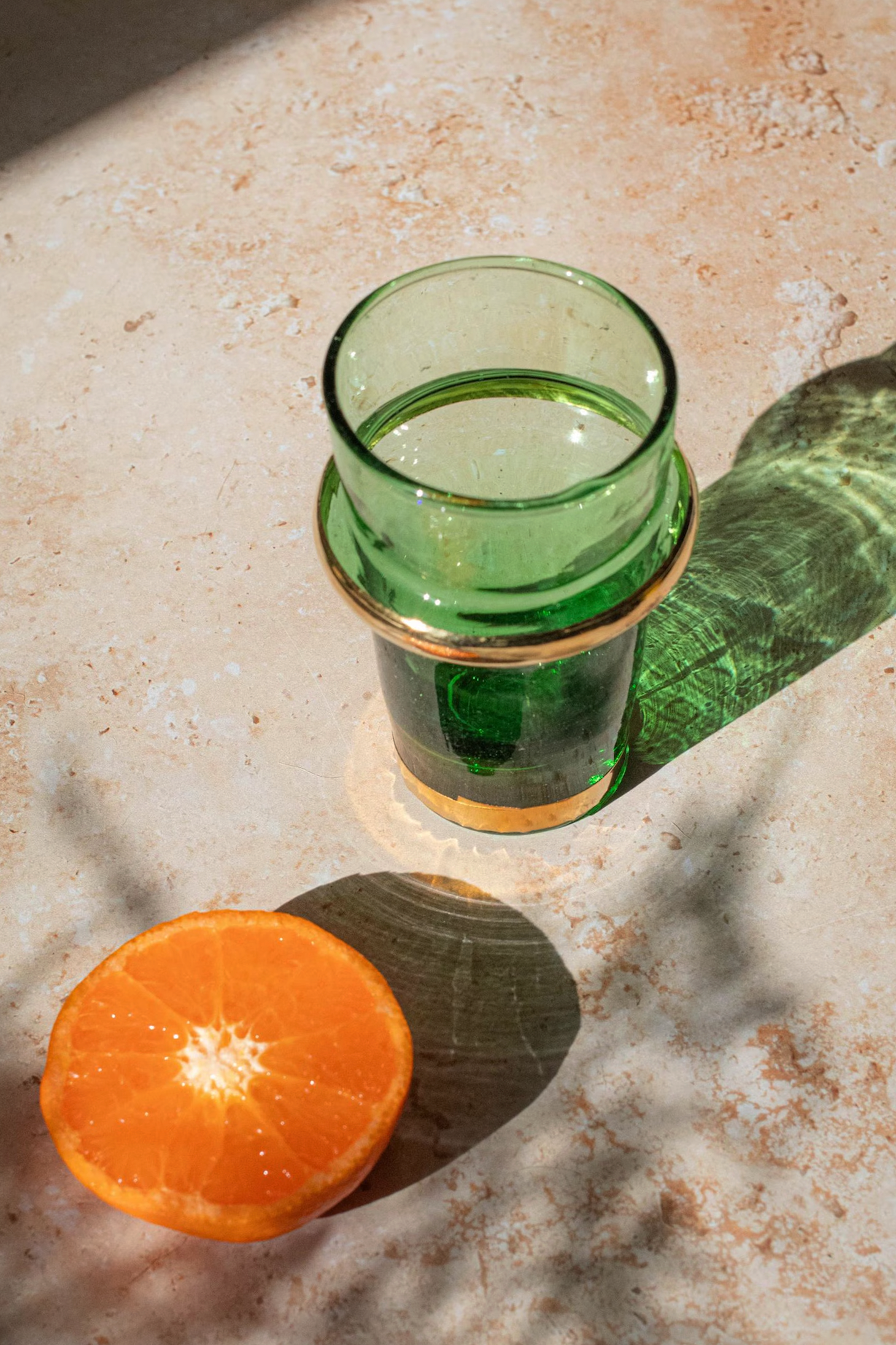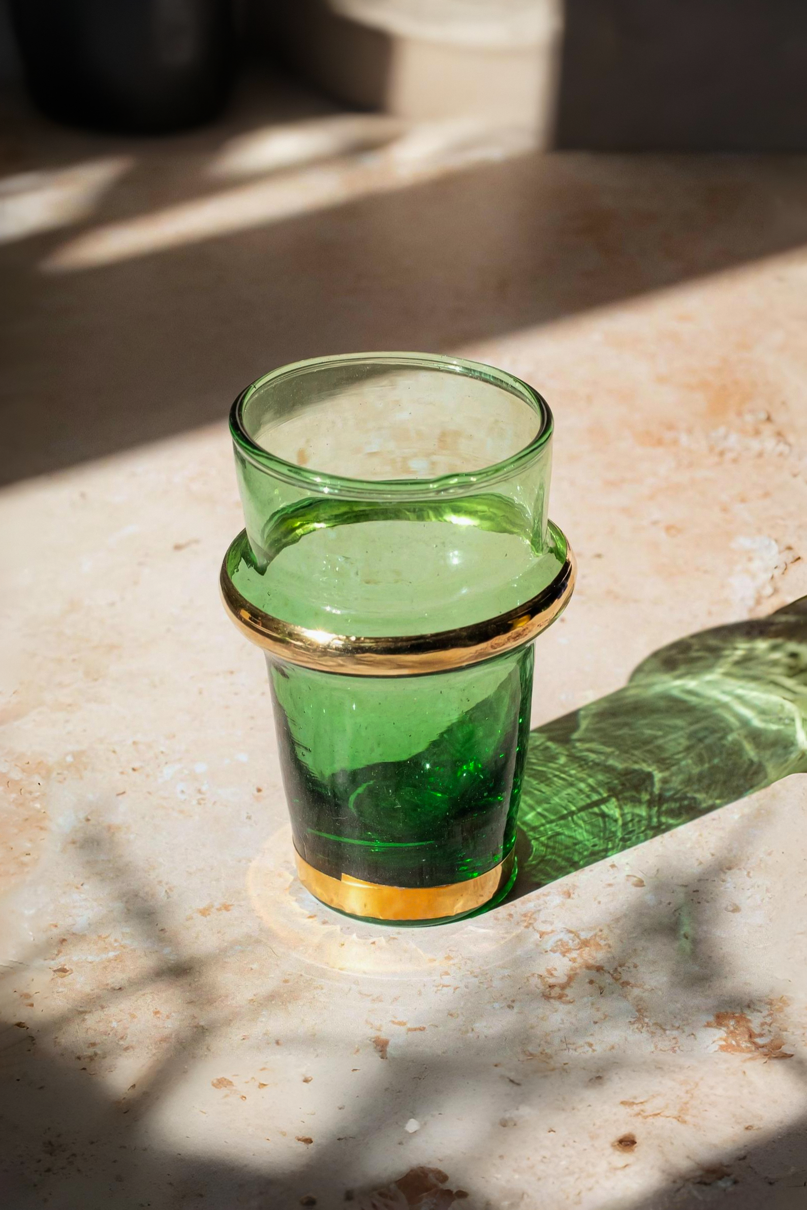 Add a touch of Moroccan elegance to your table with this Set of 6 Beldi Green Glasses with Copper Accent. Handcrafted from recycled glass and finished with Alpaca (a copper alloy of nickel and zinc), these glasses feature a distinctive green color with gold-toned accents. Perfect for serving tea, water, or as decorative pieces, they bring authenticity and charm to any setting. Each glass is handmade, combining traditional Moroccan techniques with timeless design.